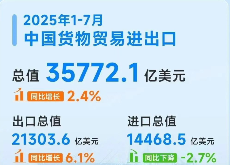 7月单月数据更加亮眼,进出口总值5453.2亿美元,增长5.9%;出口3217.8亿美元,增长7.2%。贸易顺差达982.45亿美元,凸显外需韧性。