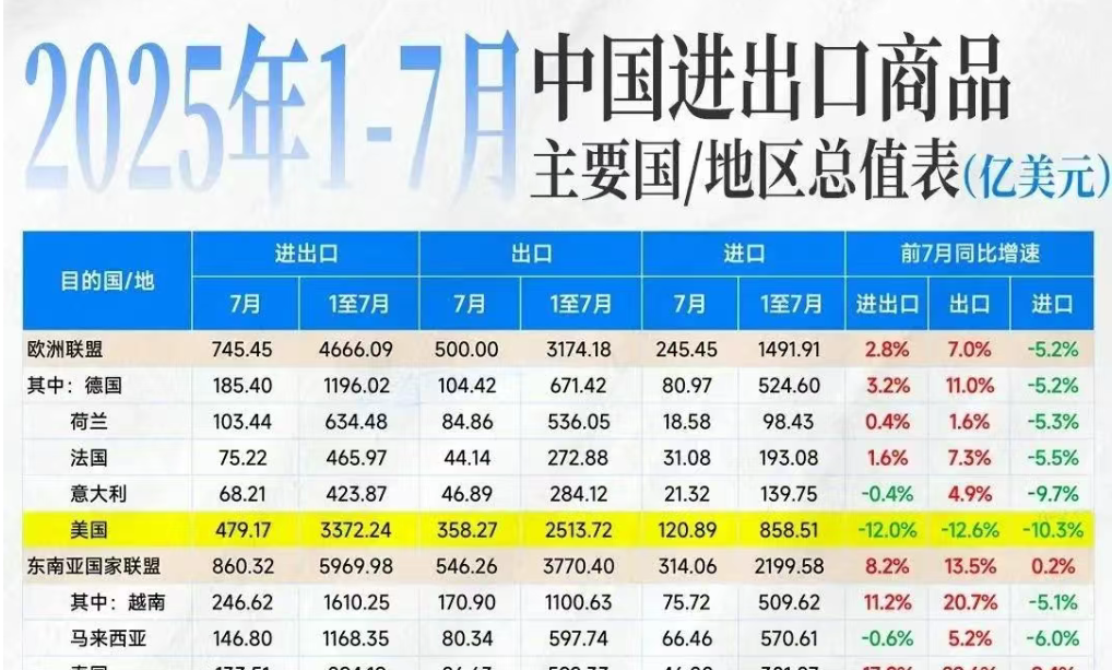 2025年前7个月中国外贸数据出炉!美国暴跌12.6%,东盟增速13.5% ,谁在补位?